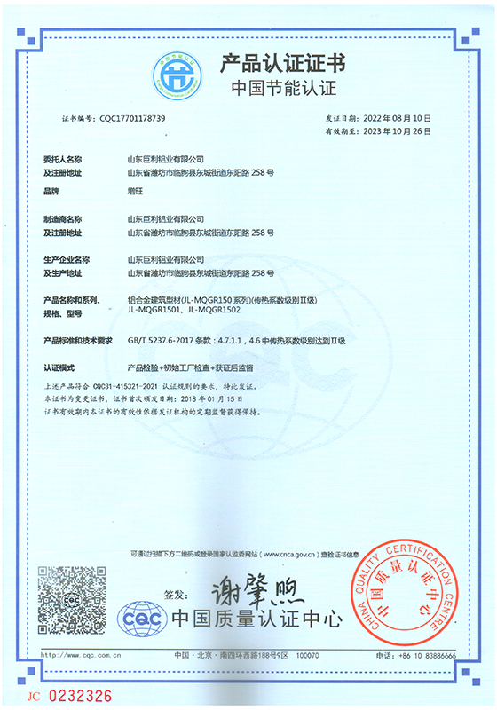 山東巨利鋁業有限公司是大型專業化鋁合金門窗、幕墻建筑型材生產企業。公司座落于中國江北最大鋁合金建筑型材生產、銷售集散地,被稱為“中國鋁業之都”的臨朐,地處山東半島中部,濰坊市西南部,沂山北麓,公司西臨彌河,東靠長深高速,北接濟青高速,地理位置優越,交通十分便利。公司占地總面積18.5萬平方米,擁有國際先進水平的擠壓、陽極氧化、電泳涂漆、粉末噴涂、氟碳噴涂、木紋轉印、隔熱斷橋等系列生產線,年生產節能環保鋁型材7萬噸。公司先后通過IS09001質量管理體系認證、ISO14001環境管理體系認證、0HSAS45001職業健康安全管理體系認證、IATF16949汽車行業質量管理體系認證和中國綠色建材產品認證。公司先后榮獲山東省專精特新中小企業、山東省高新技術企業、山東省科技型中小企業榮譽稱號。“客戶的滿意,巨利的追求”。不斷的改進和完善質量管理,不斷的提高售后服務水平,持續向客戶提供一流的產品和一流的服務,是我們巨利人孜孜以求的永恒目標,我們愿與廣大業務同仁共同努力,共創雙贏,不斷發展,走向更加輝煌的明天。
